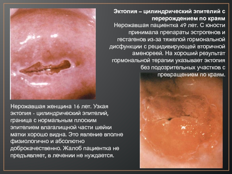 Нерожавшая пациентка 49 лет. С юности принимала препараты эстрогенов и гестагенов из-за тяжелой гормональной дисфункции с рецидивирующей вторичной аменореей. На хороший результат гормональной терапии указывает эктопия без подозрительных участков с превращением по краям.