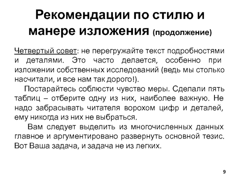 Слайд 9Рекомендации по стилю и манере изложения (продолжение)