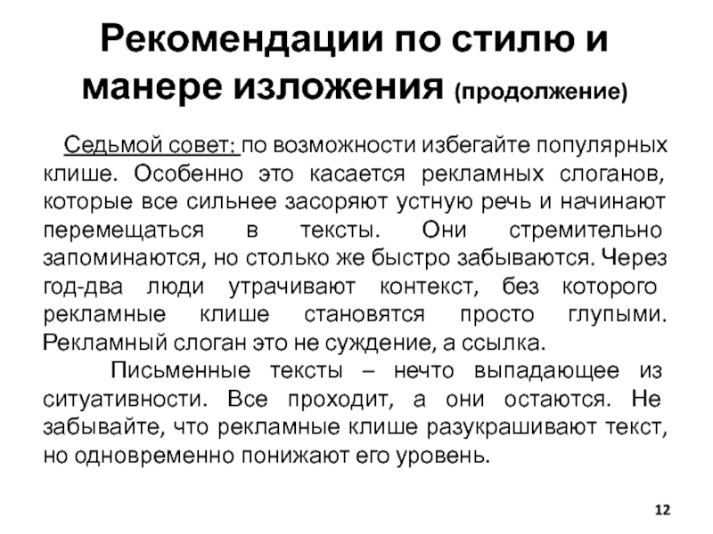 Слайд 12Рекомендации по стилю и манере изложения (продолжение)