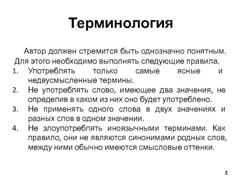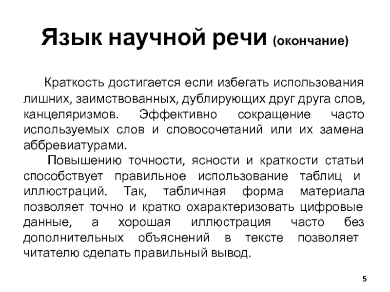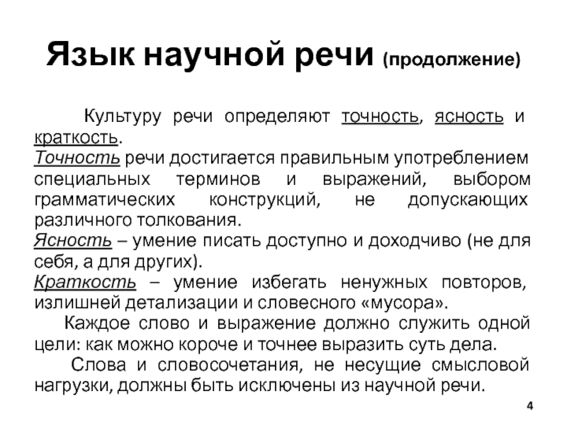 Слова и словосочетания, не несущие смысловой нагрузки, должны быть исключены из научной речи.
