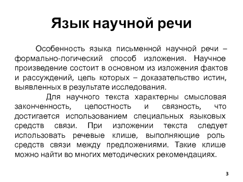 Для научного текста характерны смысловая законченность, целостность и связность, что достигается использованием специальных языковых средств связи. При изложении текста следует использовать речевые клише, выполняющие роль средств связи между предложениями. Такие клише можно найти во многих методических рекомендациях.