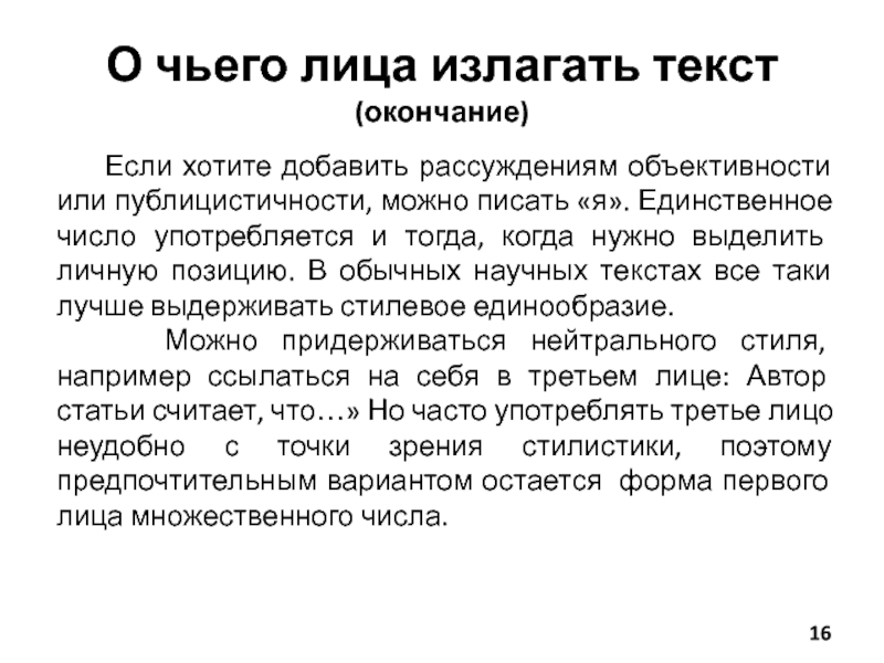 добавить рассуждениям объективности или публицистичности, можно писать «я». Единственное число
