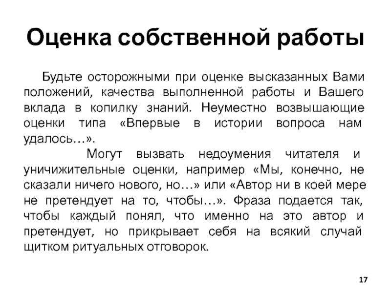 Могут вызвать недоумения читателя и уничижительные оценки, например «Мы, конечно, не сказали ничего нового, но…» или «Автор ни в коей мере не претендует на то, чтобы…». Фраза подается так, чтобы каждый понял, что именно на это автор и претендует, но прикрывает себя на всякий случай щитком ритуальных отговорок.