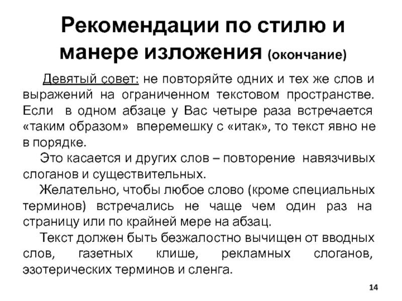 Слайд 14Рекомендации по стилю и манере изложения (окончание)