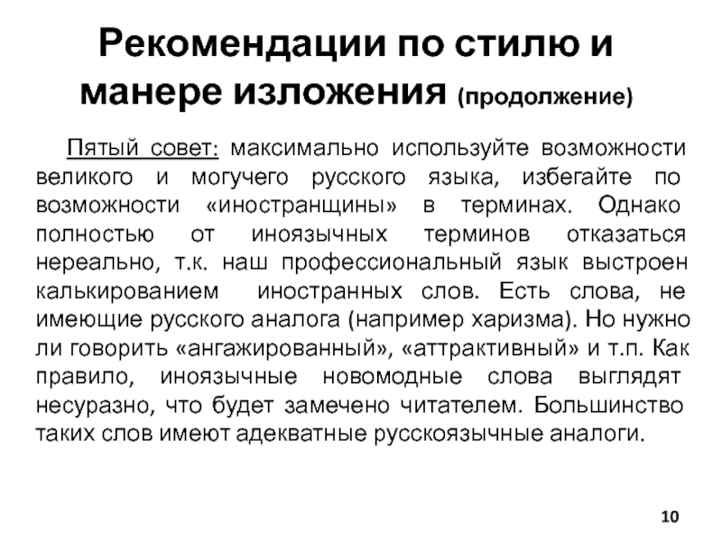 Слайд 10Рекомендации по стилю и манере изложения (продолжение)