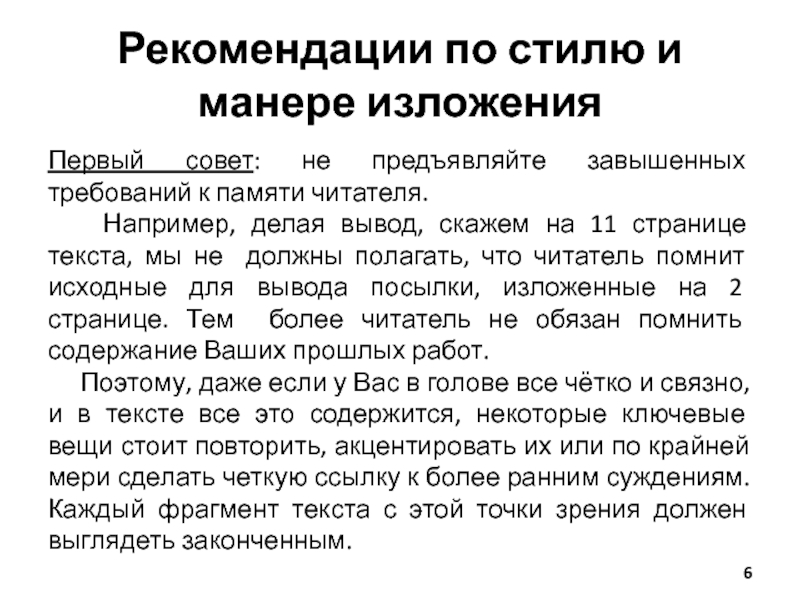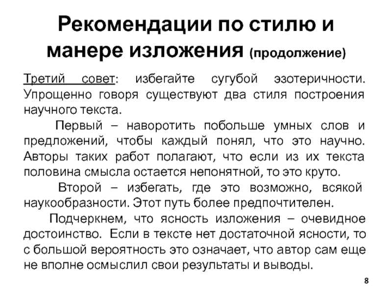 Слайд 8Рекомендации по стилю и манере изложения (продолжение)