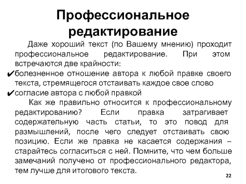 Как же правильно относится к профессиональному редактированию? Если правка затрагивает содержательную часть статьи, то это повод для размышлений, после чего следует отстаивать свою позицию. Если же правка не касается содержания – старайтесь согласиться с ней. Помните, что чем больше замечаний получено от профессионального редактора, тем лучше для итогового текста.