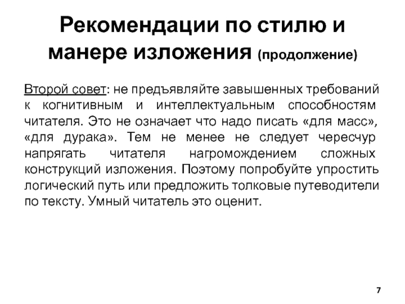 Слайд 7Рекомендации по стилю и манере изложения (продолжение)