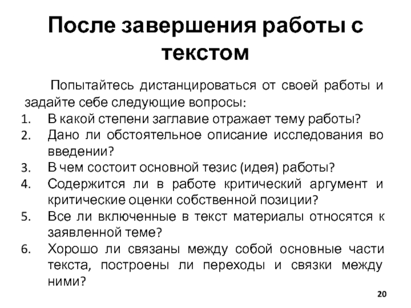 Поэтому, даже если у Вас в голове все чётко и связно, и в тексте все это содержится, некоторые ключевые вещи стоит повторить, акцентировать их или по крайней мери сделать четкую ссылку к более ранним суждениям. Каждый фрагмент текста с этой точки зрения должен выглядеть законченным.