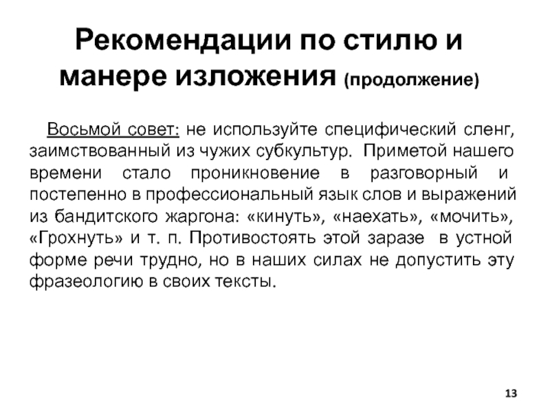 Слайд 13Рекомендации по стилю и манере изложения (продолжение)