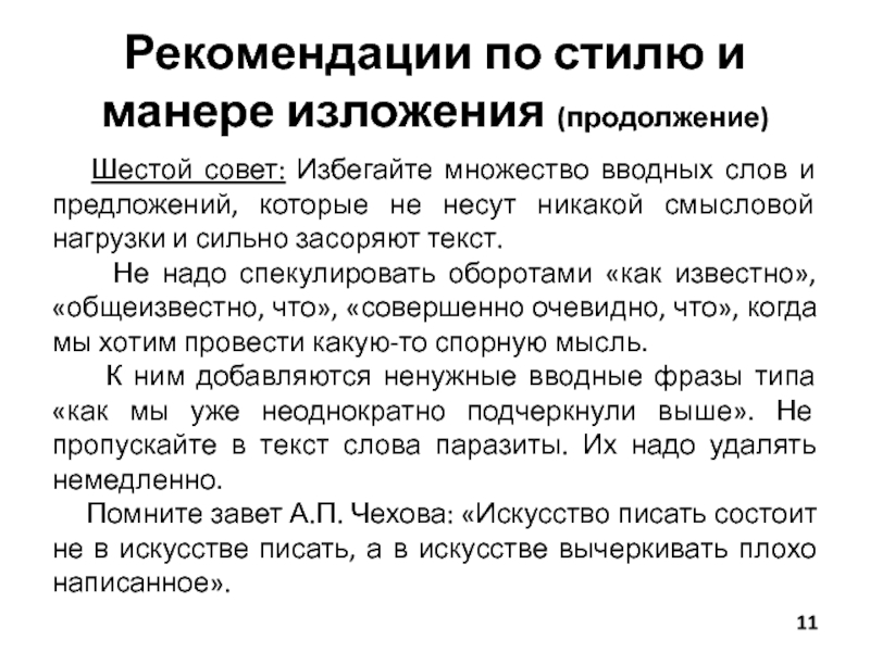 Слайд 11Рекомендации по стилю и манере изложения (продолжение)