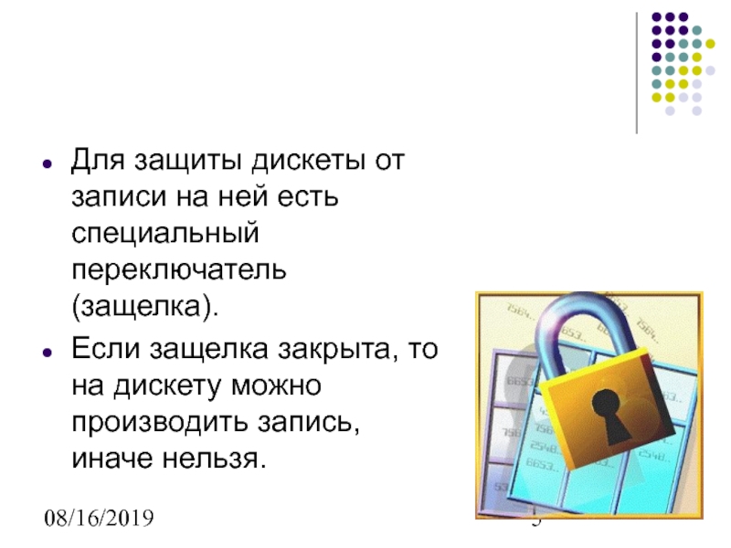 Для защиты дискеты от записи на ней есть специальный переключатель