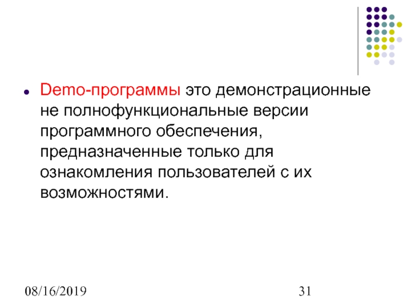 Demo-программы это демонстрационные не полнофункциональные версии программного обеспечения, предназначенные только