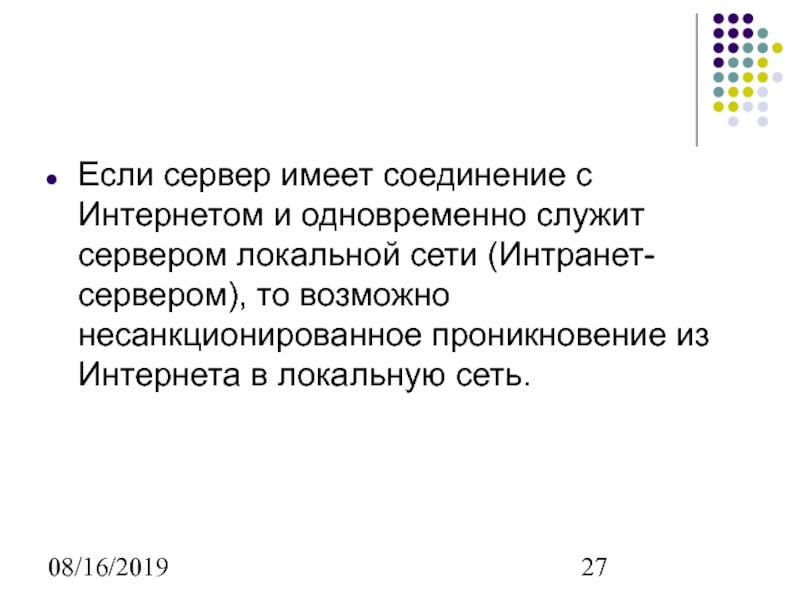 локальной сети (Интранет-сервером), то возможно несанкционированное проникновение из Интернета в