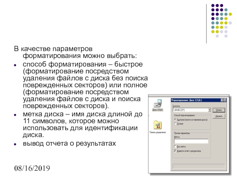 полное (форматирование посредством удаления файлов с диска и поиска поврежденных секторов).