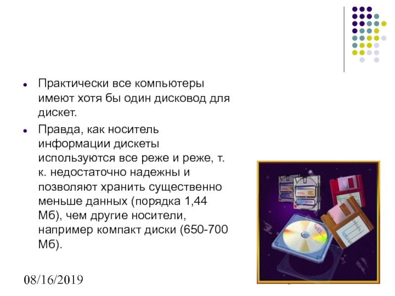 т.к. недостаточно надежны и позволяют хранить существенно меньше данных (порядка 1,44 Мб), чем другие носители, например компакт диски (650-700 Мб).
