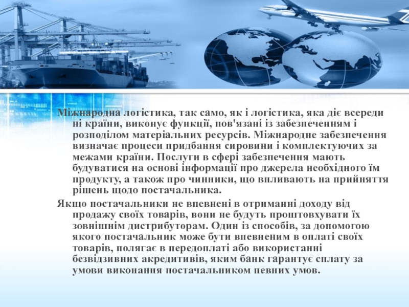 Міжнародне забезпечення визначає процеси придбання сировини і комплектуючих за межами країни. Послуги в сфері забезпечення мають будуватися на основі інформації про джерела необхідного їм продукту, а також про чинники, що впливають на прийняття рішень щодо постачальника.