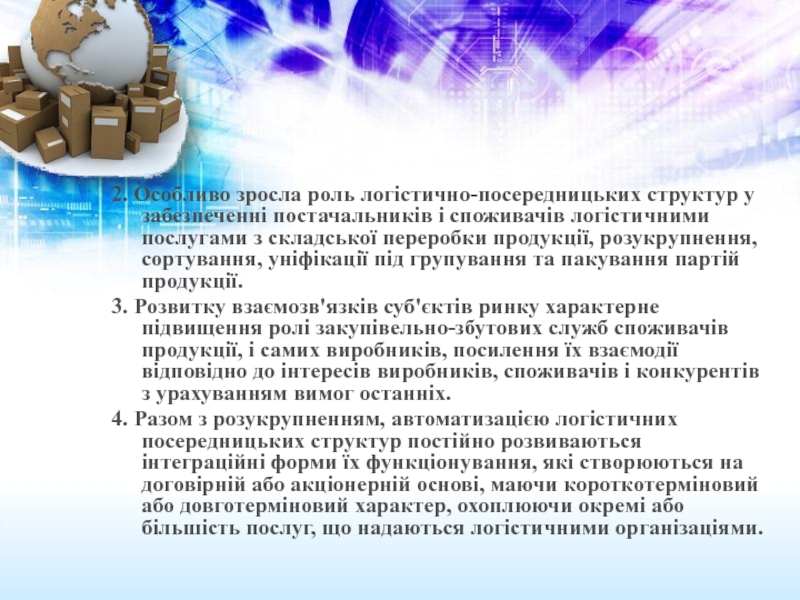 Слайд 82. Особливо зросла роль логістично-посередницьких структур у забезпеченні постачальників і