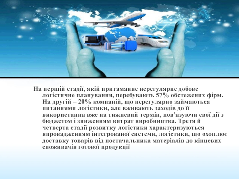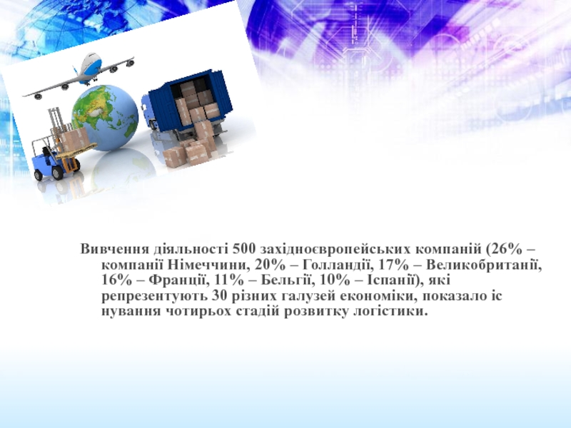 Бельгії, 10% – Іспанії), які репрезентують 30 різних галузей економіки, показало існування чотирьох стадій розвитку логістики.
