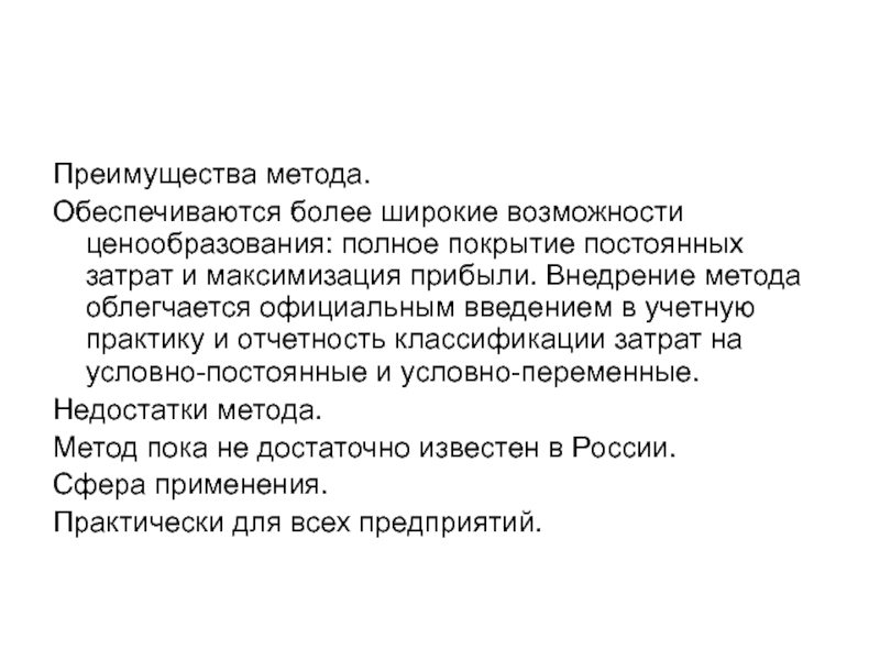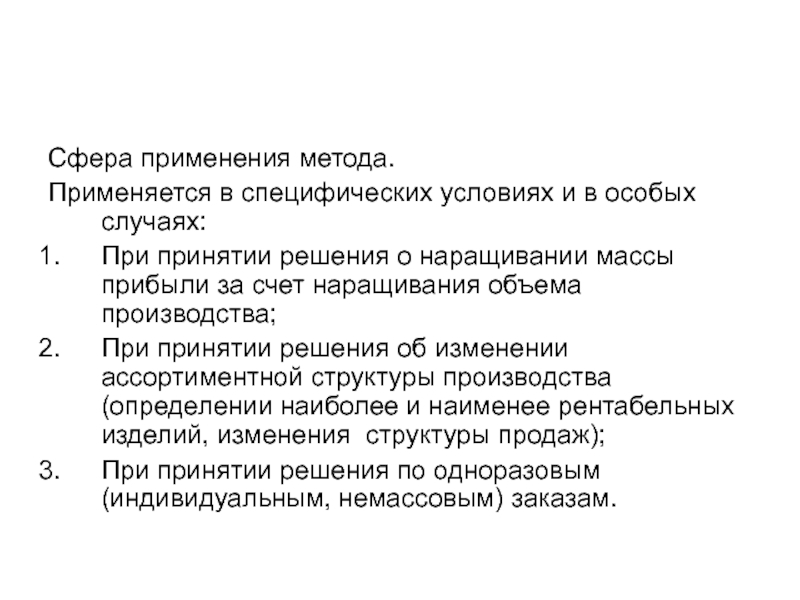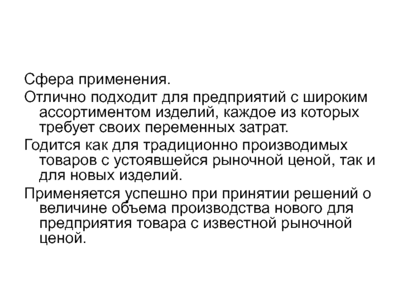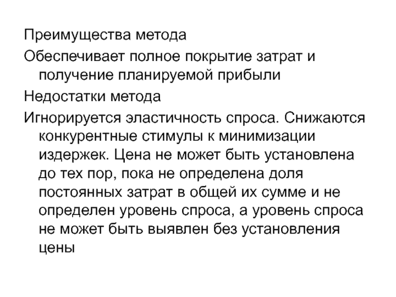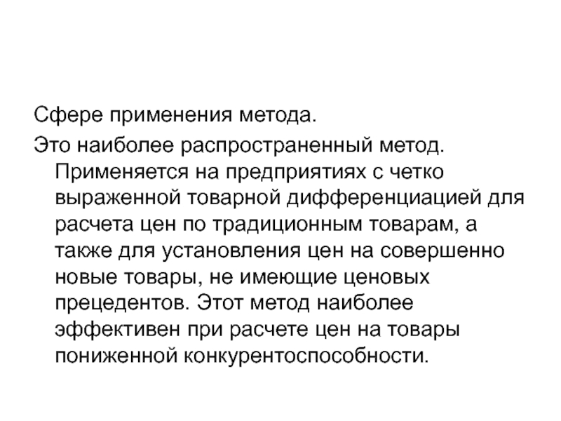 а также для установления цен на совершенно новые товары, не имеющие ценовых прецедентов. Этот метод наиболее эффективен при расчете цен на товары пониженной конкурентоспособности.