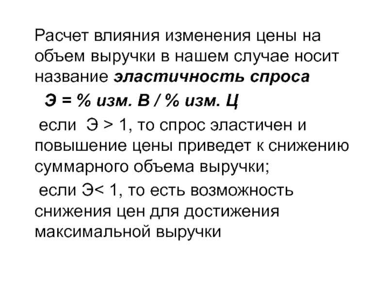 если Э > 1, то спрос эластичен и повышение цены приведет к снижению суммарного объема выручки;