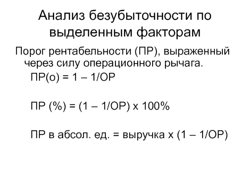 Слайд 77Анализ безубыточности по выделенным факторам