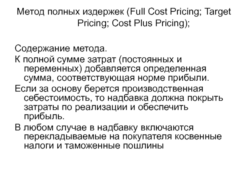 Слайд 15Метод полных издержек (Full Cost Pricing; Target Pricing; Cost Plus