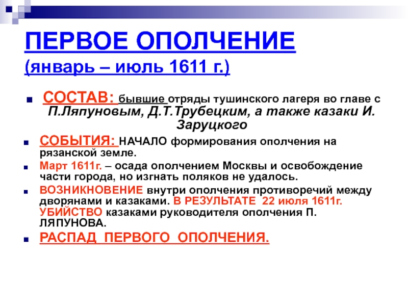 ВОЗНИКНОВЕНИЕ внутри ополчения противоречий между дворянами и казаками. В РЕЗУЛЬТАТЕ 22 июля 1611г. УБИЙСТВО казаками руководителя ополчения П.ЛЯПУНОВА.
