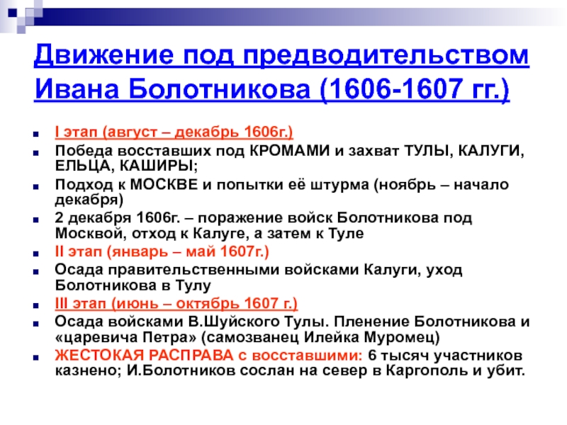 2 декабря 1606г. – поражение войск Болотникова под Москвой, отход к Калуге, а затем к Туле