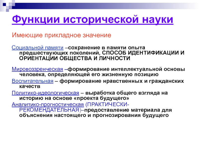 Политико-идеологическая – выработка общего взгляда на историю на основе «проекта будущего»