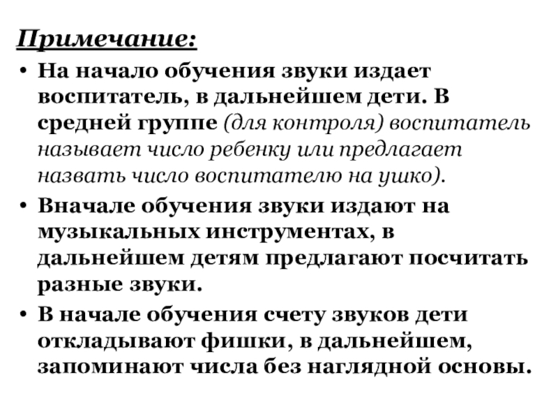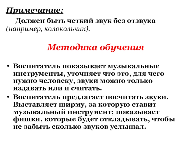 Вначале обучения звуки издают на музыкальных инструментах, в дальнейшем детям предлагают посчитать разные звуки.