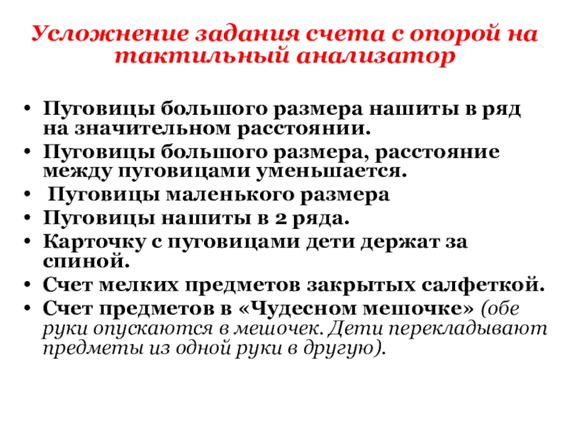 Слайд 23Усложнение задания счета с опорой на тактильный анализатор