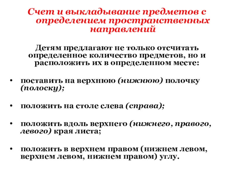 Слайд 9Счет и выкладывание предметов с определением пространственных направлений
