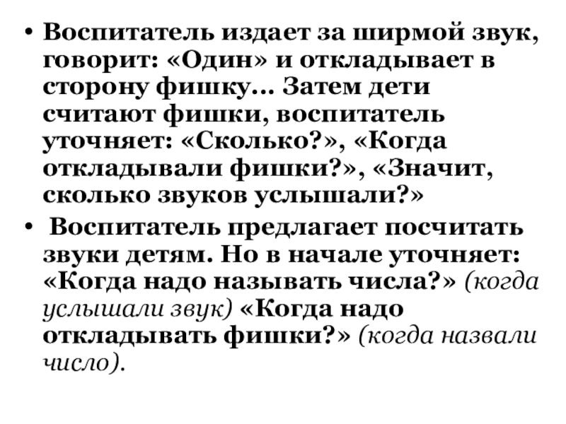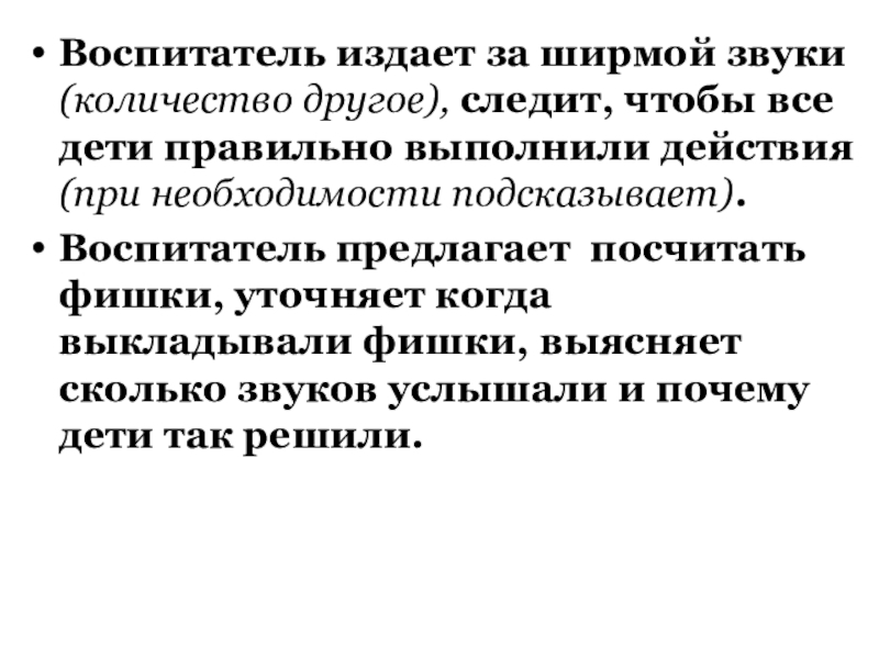 Слайд 14Воспитатель издает за ширмой звуки (количество другое), следит, чтобы все
