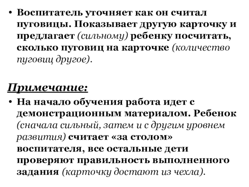 На начало обучения работа идет с демонстрационным материалом. Ребенок (сначала сильный, затем и с другим уровнем развития) считает «за столом» воспитателя, все остальные дети проверяют правильность выполненного задания (карточку достают из чехла).