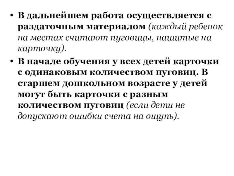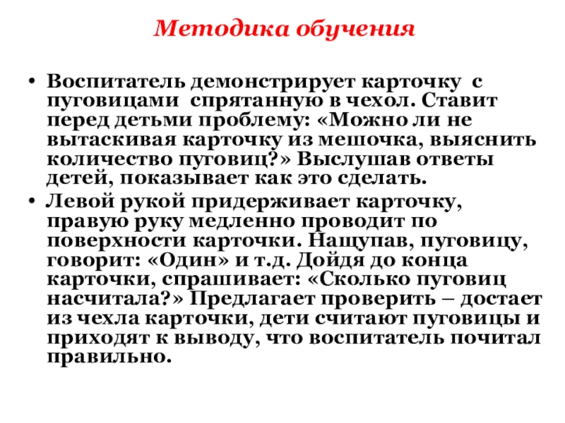 Левой рукой придерживает карточку, правую руку медленно проводит по поверхности карточки. Нащупав, пуговицу, говорит: «Один» и т.д. Дойдя до конца карточки, спрашивает: «Сколько пуговиц насчитала?» Предлагает проверить – достает из чехла карточки, дети считают пуговицы и приходят к выводу, что воспитатель почитал правильно.