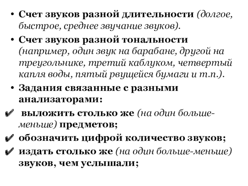 Слайд 17Счет звуков разной длительности (долгое, быстрое, среднее звучание звуков).