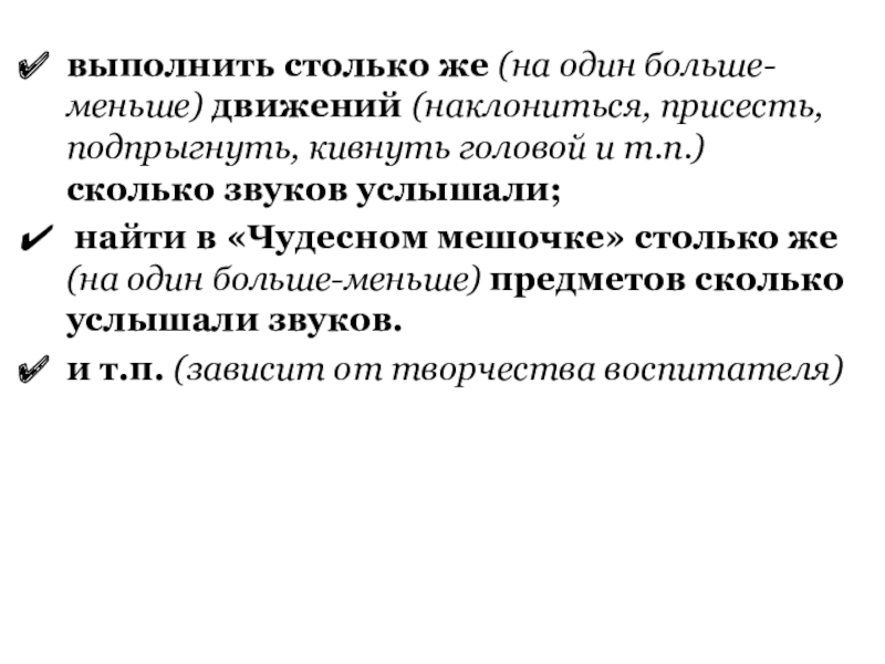 Слайд 18выполнить столько же (на один больше-меньше) движений (наклониться, присесть, подпрыгнуть,