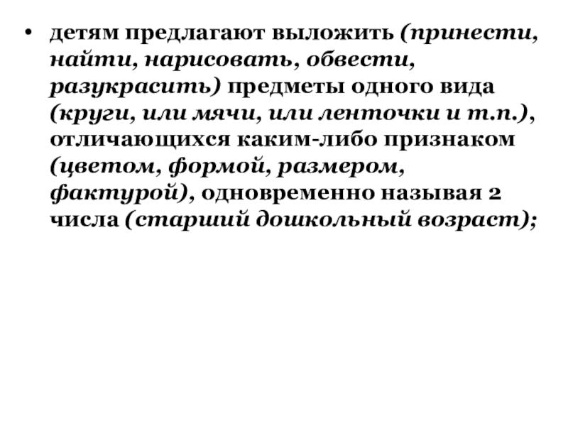 Слайд 8детям предлагают выложить (принести, найти, нарисовать, обвести, разукрасить) предметы одного