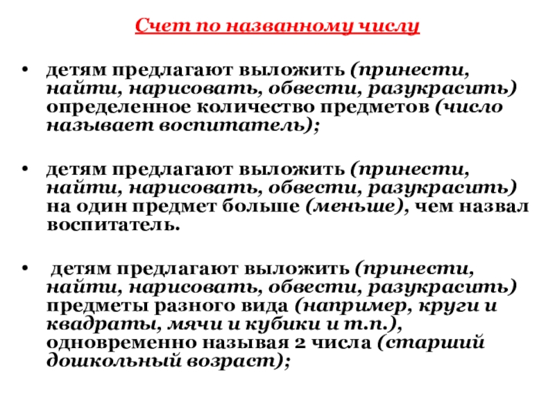 детям предлагают выложить (принести, найти, нарисовать, обвести, разукрасить) предметы разного вида (например, круги и квадраты, мячи и кубики и т.п.), одновременно называя 2 числа (старший дошкольный возраст);