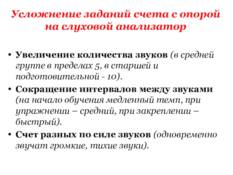 Слайд 16Усложнение заданий счета с опорой на слуховой анализатор