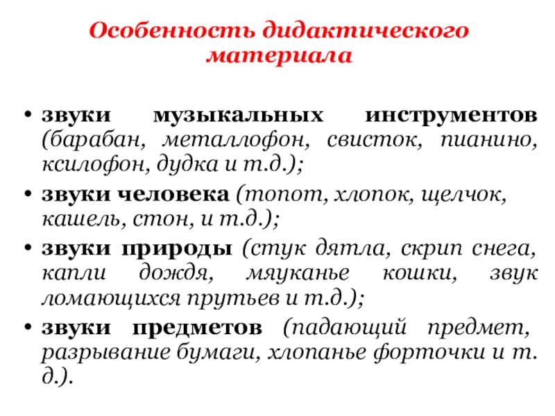 звуки природы (стук дятла, скрип снега, капли дождя, мяуканье кошки, звук ломающихся прутьев и т.д.);