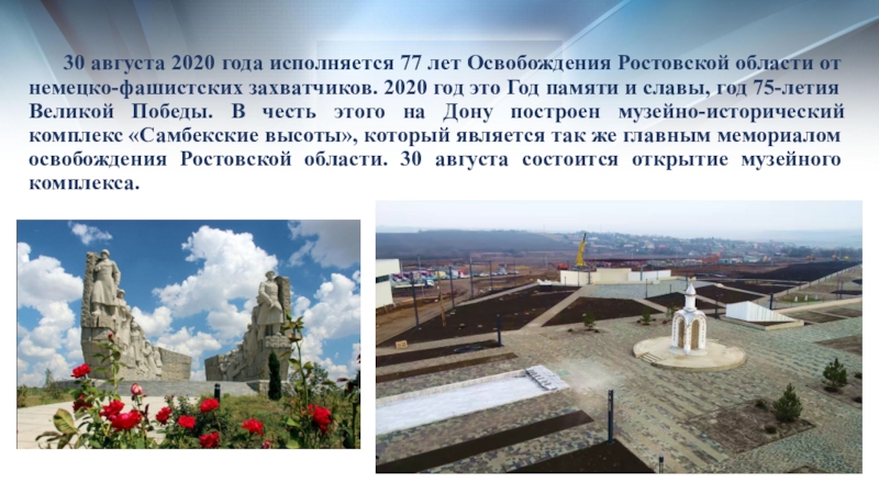 памяти и славы, год 75-летия Великой Победы. В честь этого на Дону построен музейно-исторический комплекс «Самбекские высоты», который является так же главным мемориалом освобождения Ростовской области. 30 августа состоится открытие музейного комплекса.