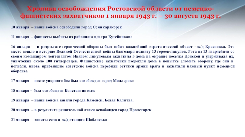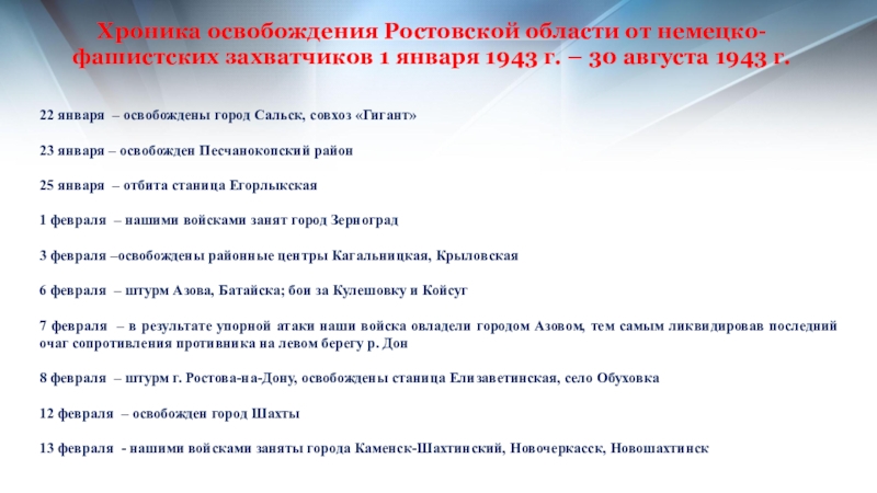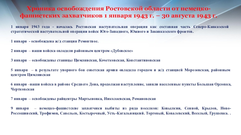 Слайд 13Хроника освобождения Ростовской области от немецко-фашистских захватчиков 1 января 1943