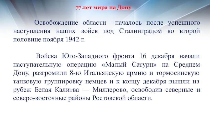 Войска Юго-Западного фронта 16 декабря начали наступательную операцию «Малый Сатурн» на Среднем Дону, разгромили 8-ю Итальянскую армию и тормосинскую танковую группировку немцев и к концу декабря вышли на рубеж Белая Калитва — Миллерово, освободив северные и северо-восточные районы Ростовской области.