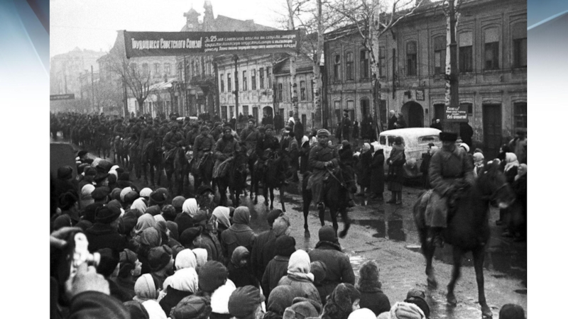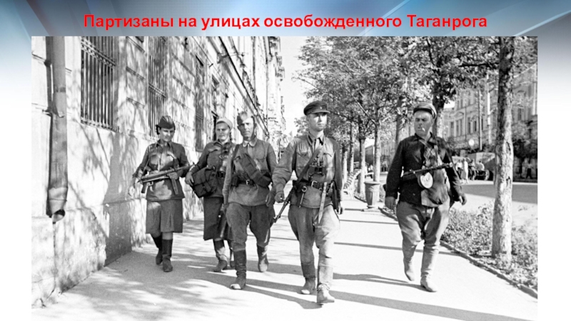 Слайд 21Партизаны на улицах освобожденного Таганрога