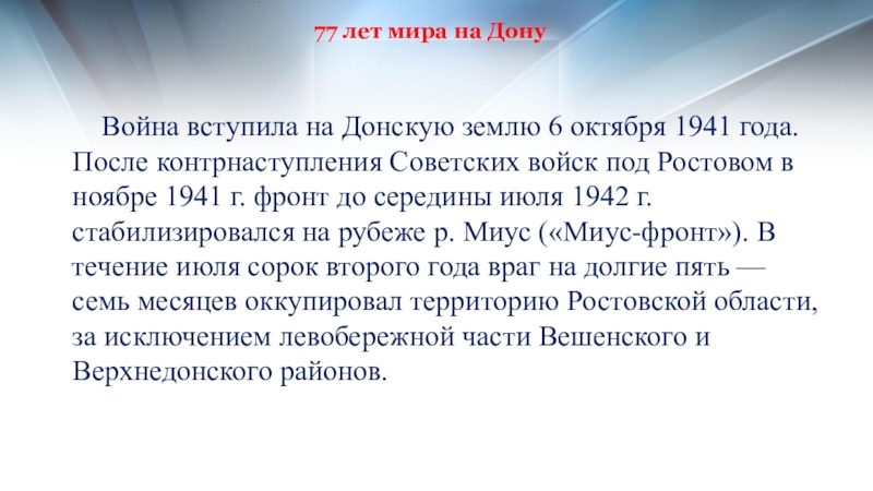 После контрнаступления Советских войск под Ростовом в ноябре 1941 г. фронт до середины июля 1942 г. стабилизировался на рубеже р. Миус («Миус-фронт»). В течение июля сорок второго года враг на долгие пять — семь месяцев оккупировал территорию Ростовской области, за исключением левобережной части Вешенского и Верхнедонского районов.