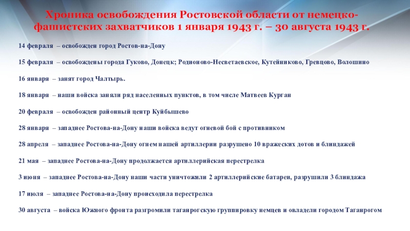 Слайд 14Хроника освобождения Ростовской области от немецко-фашистских захватчиков 1 января 1943