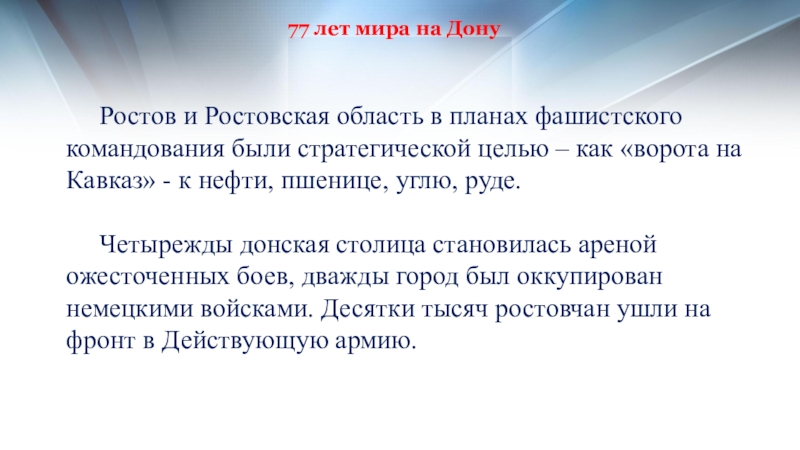Четырежды донская столица становилась ареной ожесточенных боев, дважды город был оккупирован немецкими войсками. Десятки тысяч ростовчан ушли на фронт в Действующую армию.