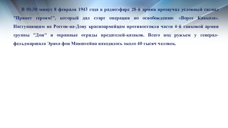 дал старт операции по освобождению «Ворот Кавказа». Наступающим на Ростов-на-Дону красноармейцам противостояли части 4-й танковой армии группы "Дон" и охранные отряды предателей-казаков. Всего под ружьем у генерал-фельдмаршала Эриха фон Манштейна находилось около 40 тысяч человек.